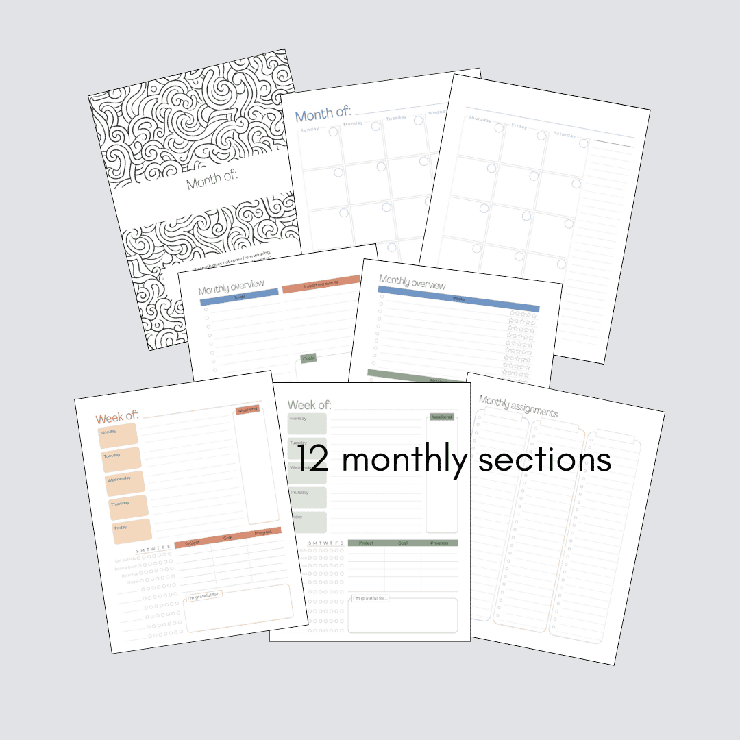 - 12 monthly sections with calendar, overview, assignments, and weekly pages