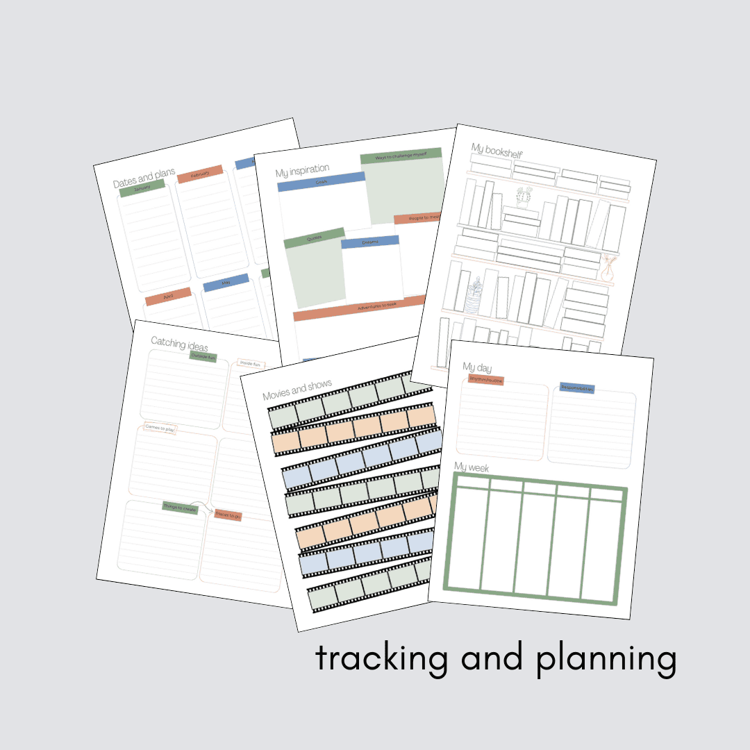 - Monthly overview (2 pages) – plan for the month ahead and track books read and movies watched