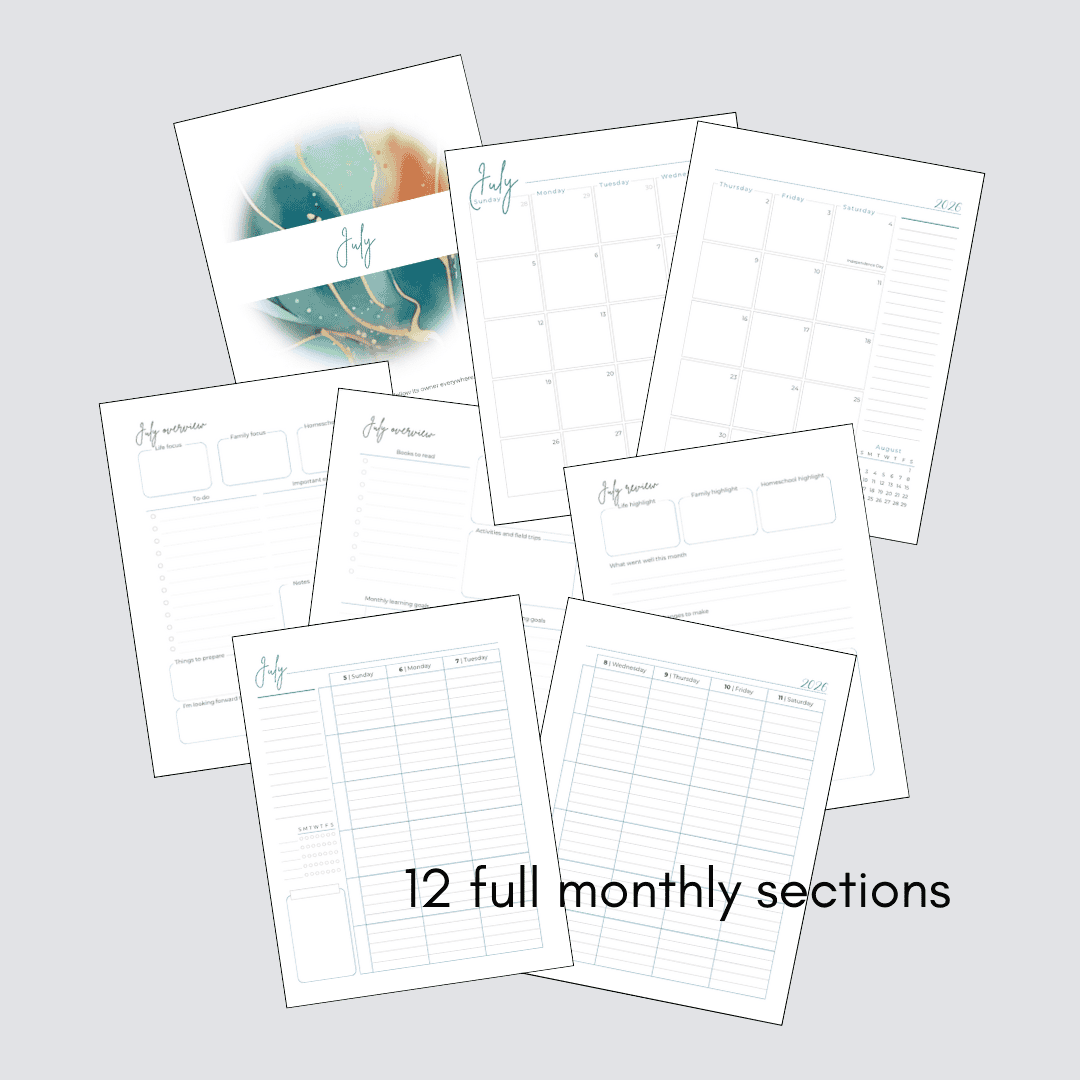 - Quarterly – Undated 3 month planner you can start using at any point in the year. Includes a basic planning section for the next 3 month quarter. Followed by 3 undated monthly sections just like you find in the full version. Pair with the Annual Essentials Planner and Simple Record Keeper for annual planning and records to complete the Modular Footpath Homeschool Planner.