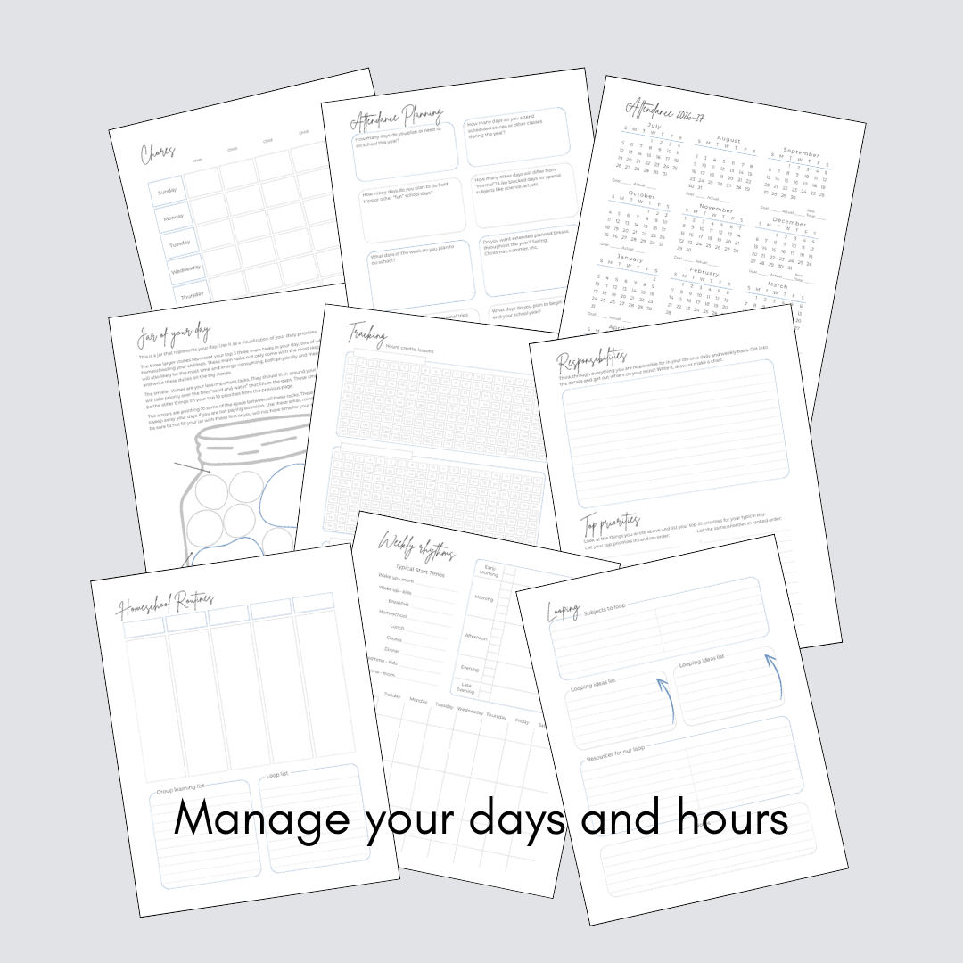 - Year at a glance: 4 pages for an at-a-glance picture of your plans for each child, including routines, curriculum, and chores