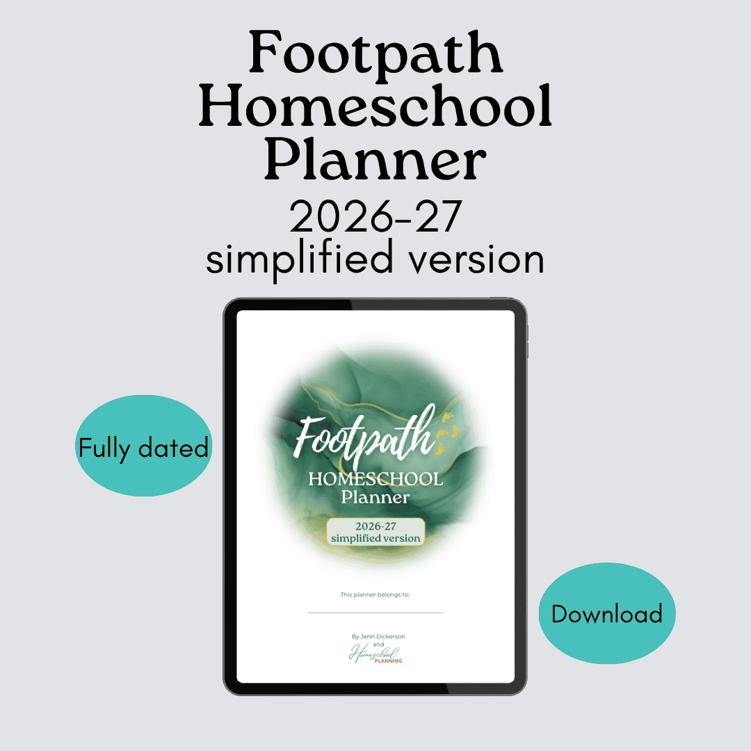 The Simplified Footpath Homeschool Planner is a dated 12-month planner designed for homeschoolers who want a clear and focused way to organize your year.