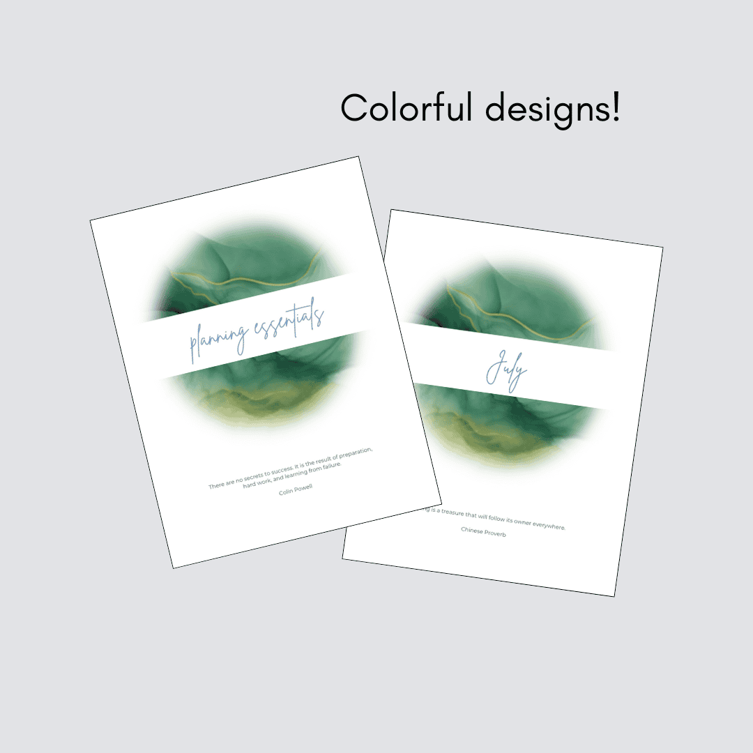 - Dated – Fully dated 12 month planner with a July start. Includes a front section with 40+ unique planning pages. Extensive review pages – monthly, mid-year, and annual – are also included. Sunday start on the monthly calendar and weekly spreads.