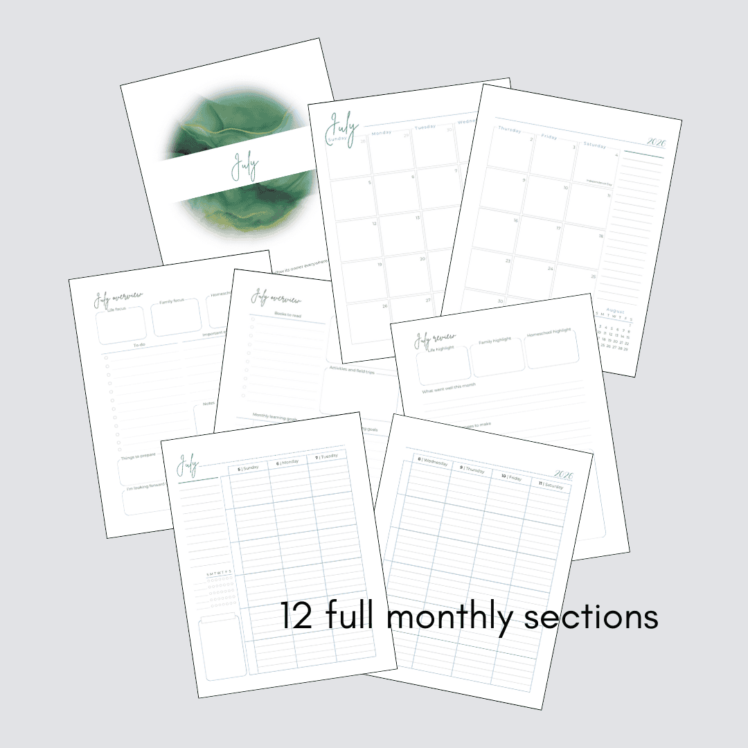 - Quarterly – Undated 3 month planner you can start using at any point in the year. Includes a basic planning section for the next 3 month quarter. Followed by 3 undated monthly sections just like you find in the full version. Pair with the Annual Essentials Planner and Simple Record Keeper for annual planning and records to complete the Modular Footpath Homeschool Planner.